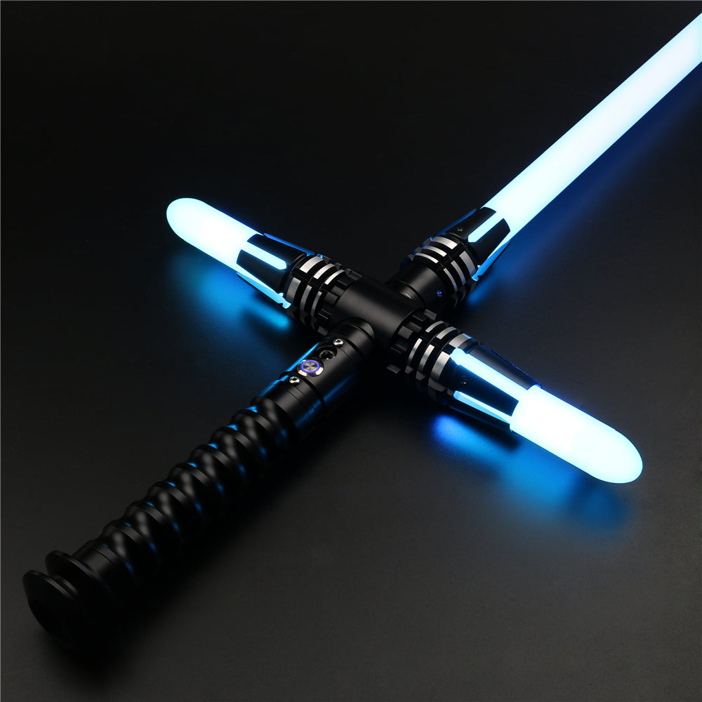 KY’s battle series, Vlad – a Kylo Ren inspiration. This cross-hilt saber is available as a heavy dueler RGB or as a sweet swinging SN-Pixel blade. Comes with 12 preloaded colours and 27 preloaded sounds straight out of the films and the many tv shows. Both versions have bluetooth capability that be paired with the ForcePark app on your phone to customize your saber fonts and colours. Load your own fonts with the large 32G SD card.